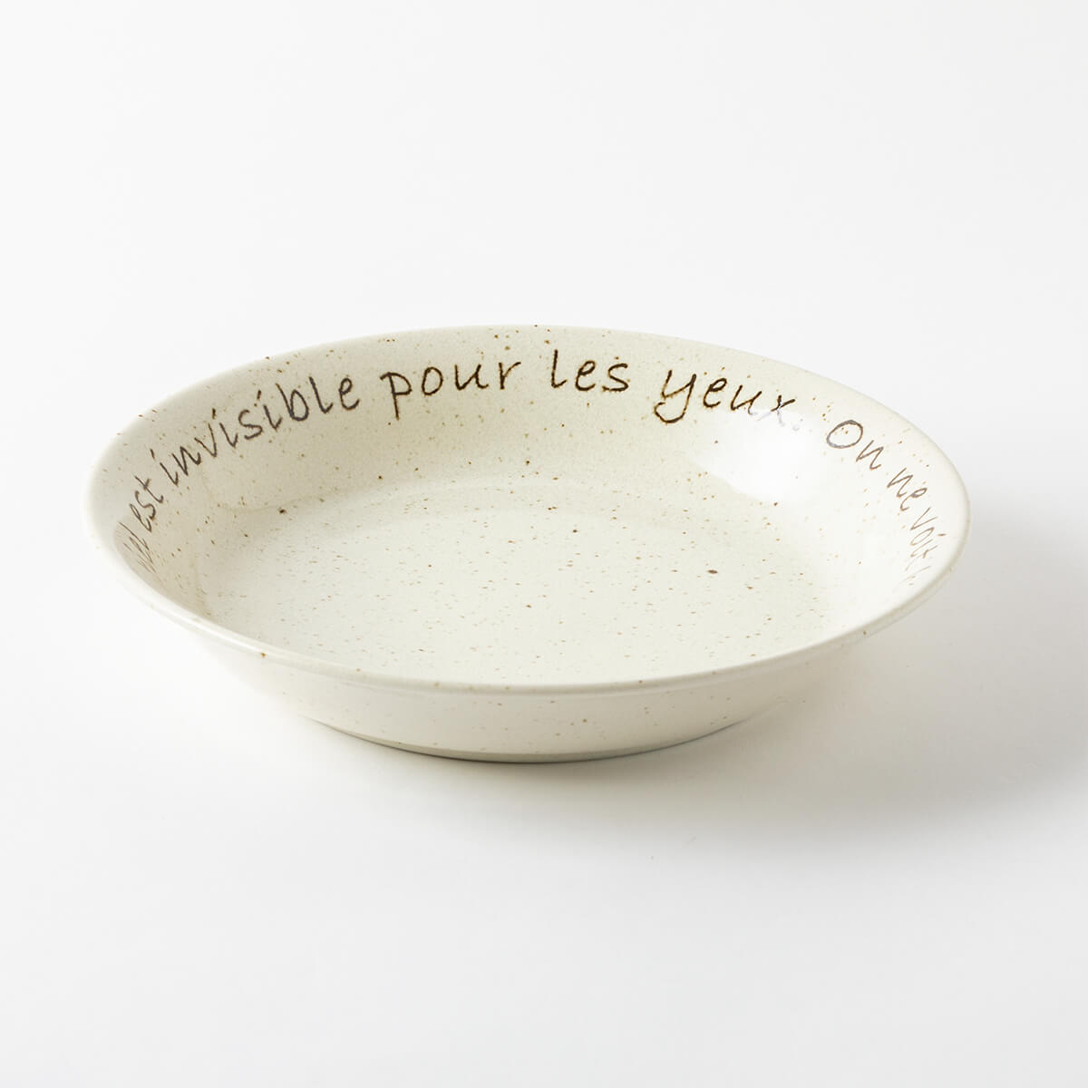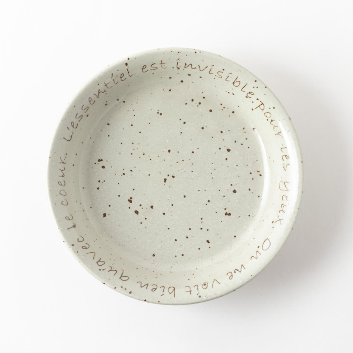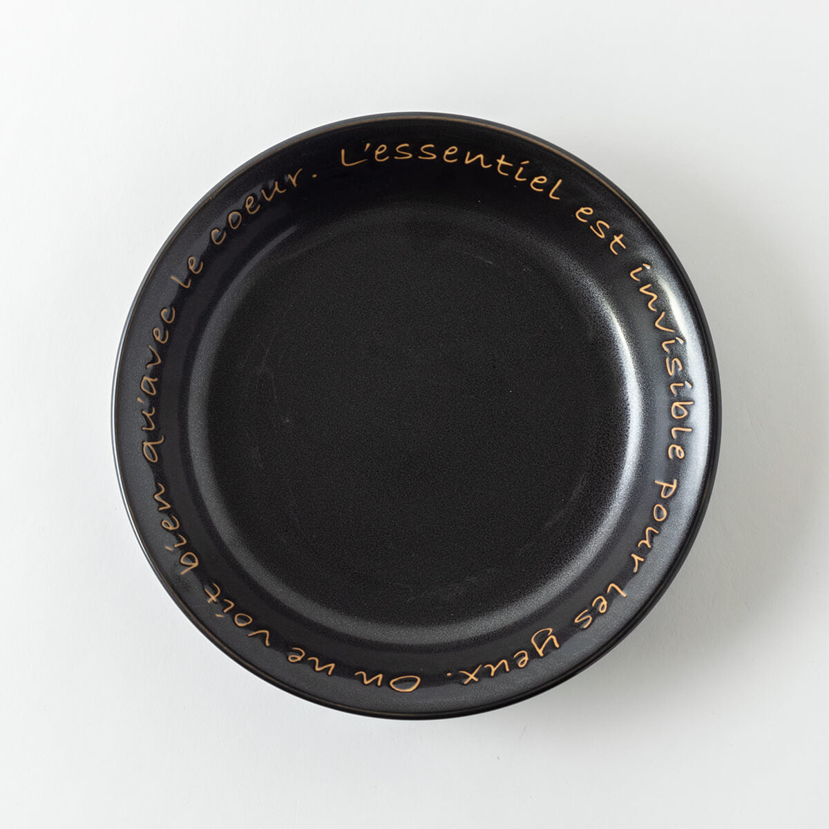 お皿の縁に書かれたフランス語は、「心でしかよく見えないんだよ、大切なものは目には見えないんだ。」 -サン=テグジュベリー「星の王子様」より。
