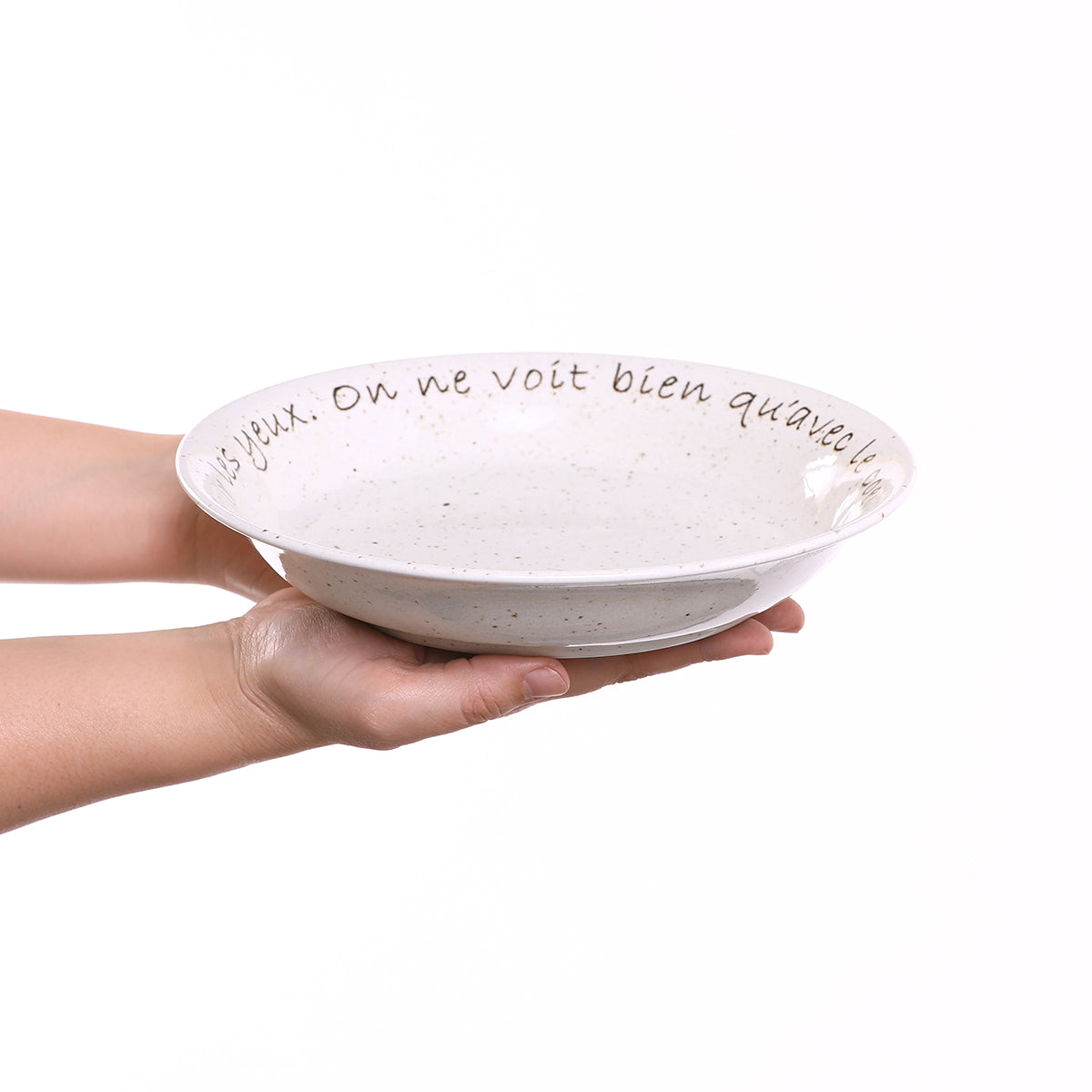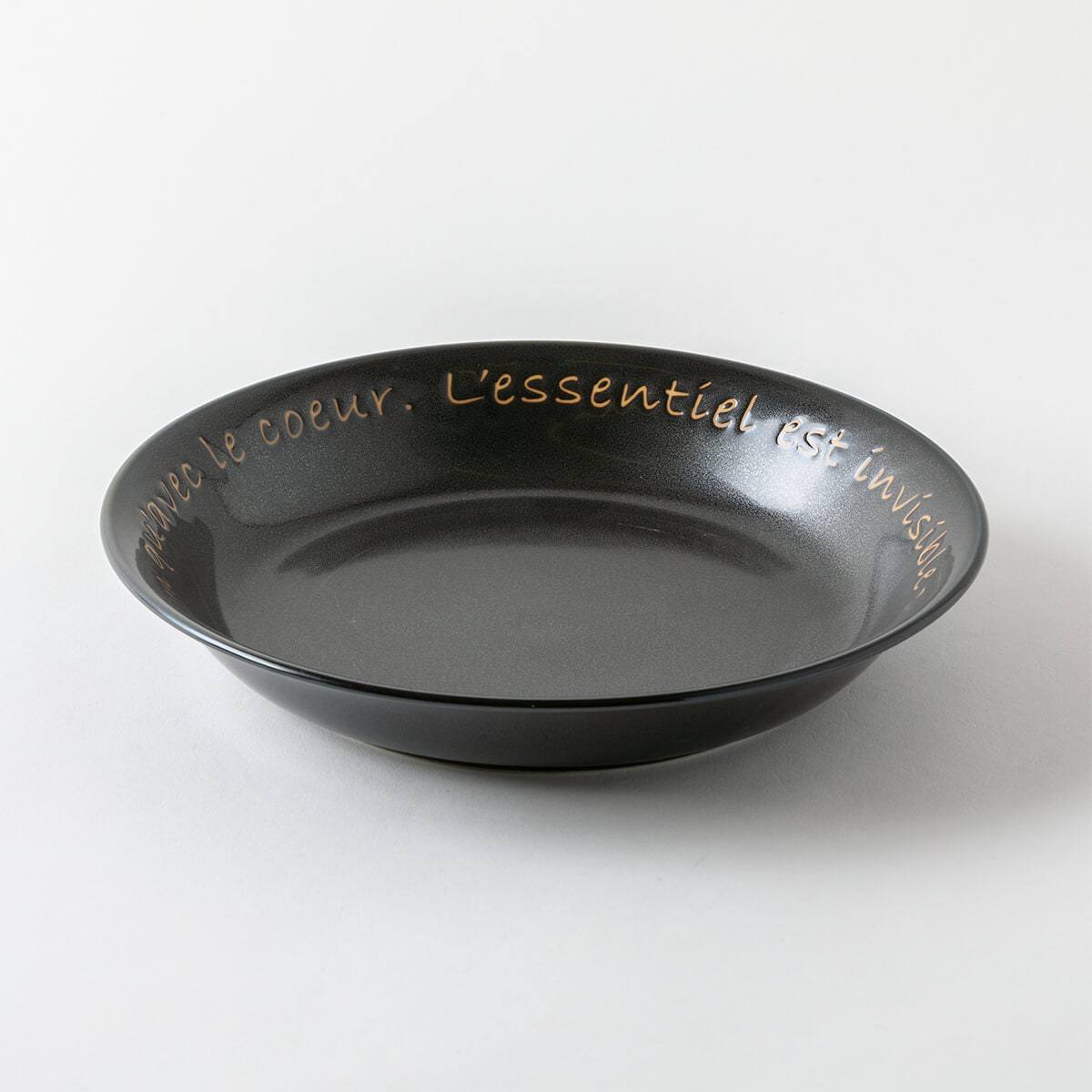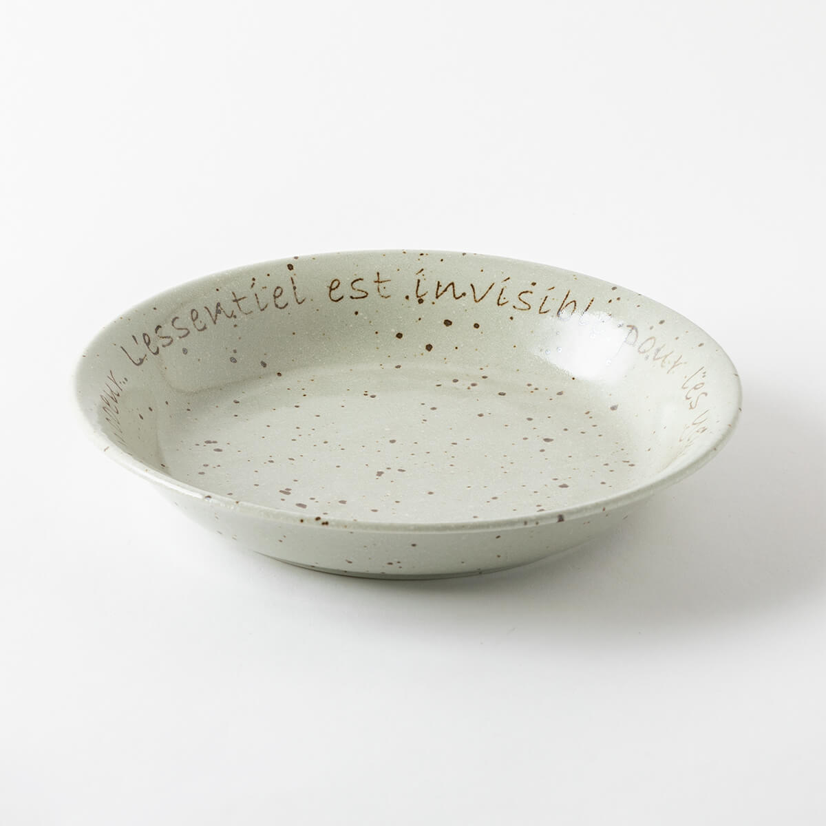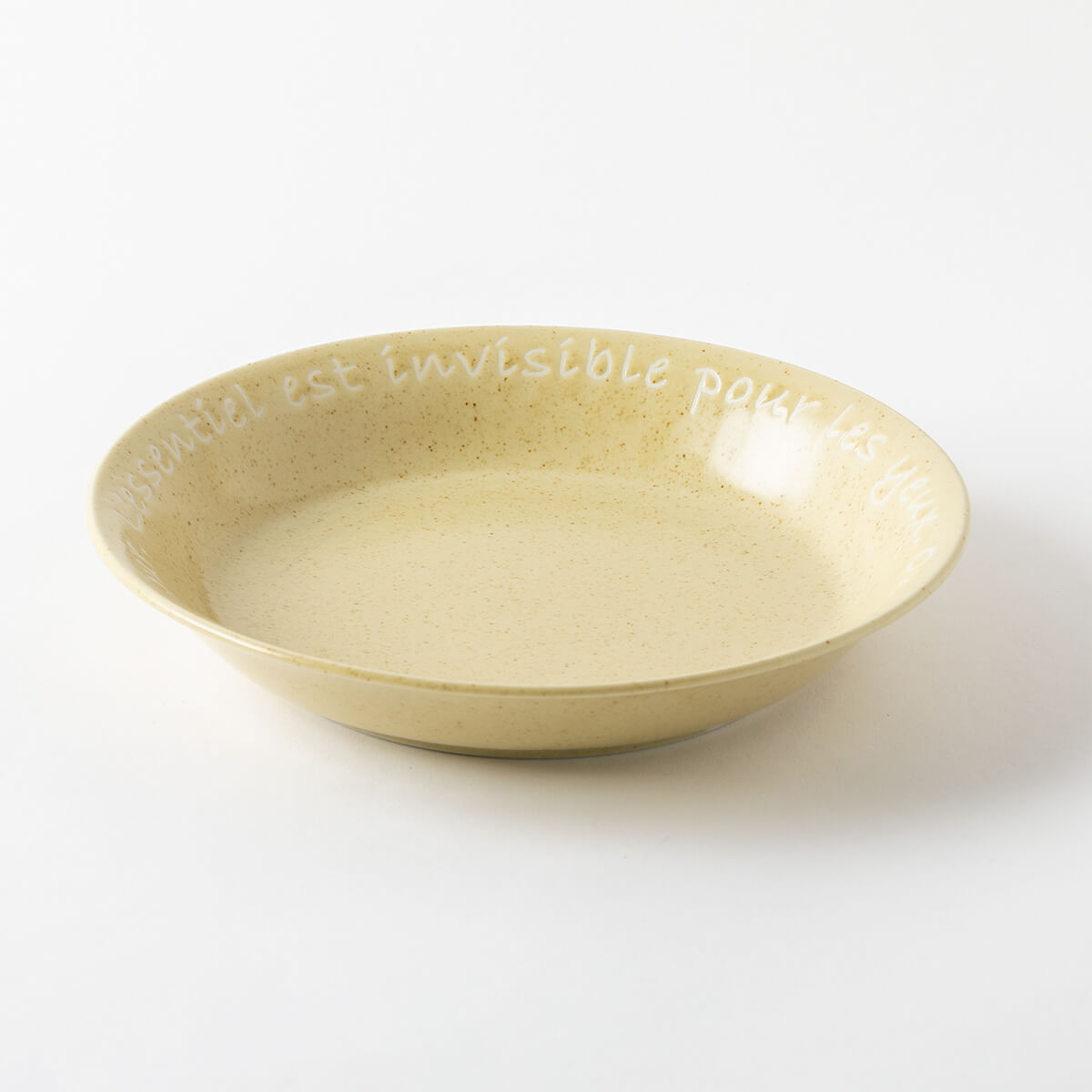 お皿の縁に書かれたフランス語は、「心でしかよく見えないんだよ、大切なものは目には見えないんだ。」 -サン=テグジュベリー「星の王子様」より。