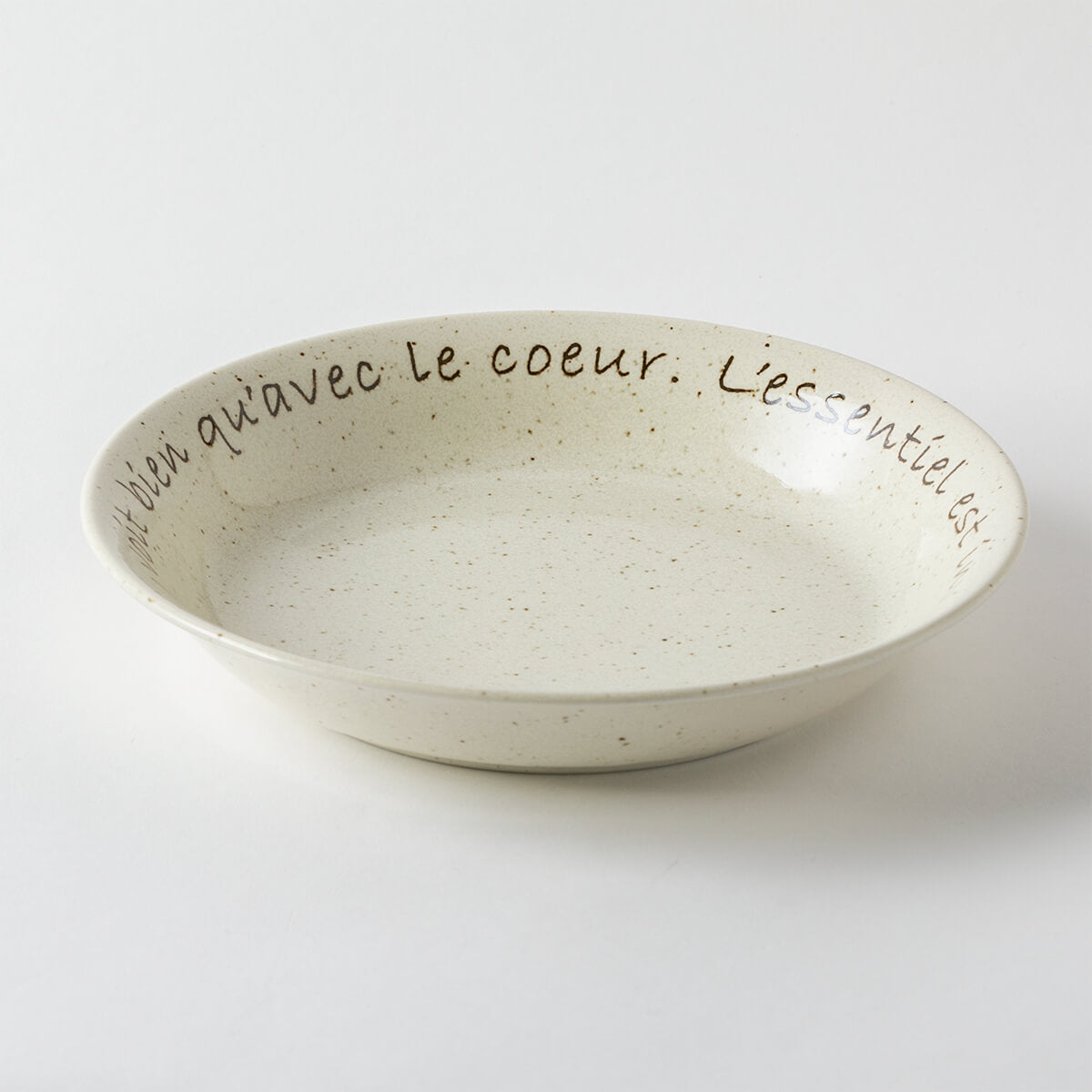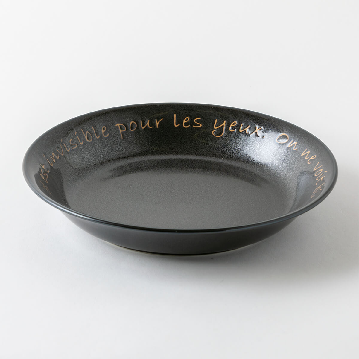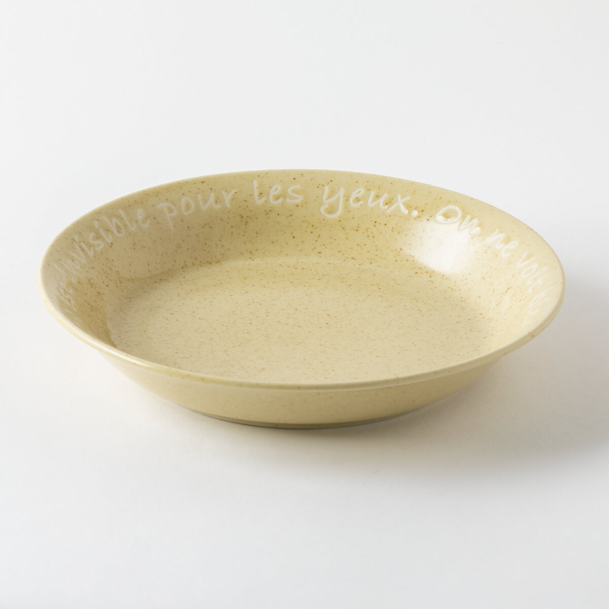 お皿の縁に書かれたフランス語は、「心でしかよく見えないんだよ、大切なものは目には見えないんだ。」 -サン=テグジュベリー「星の王子様」より。