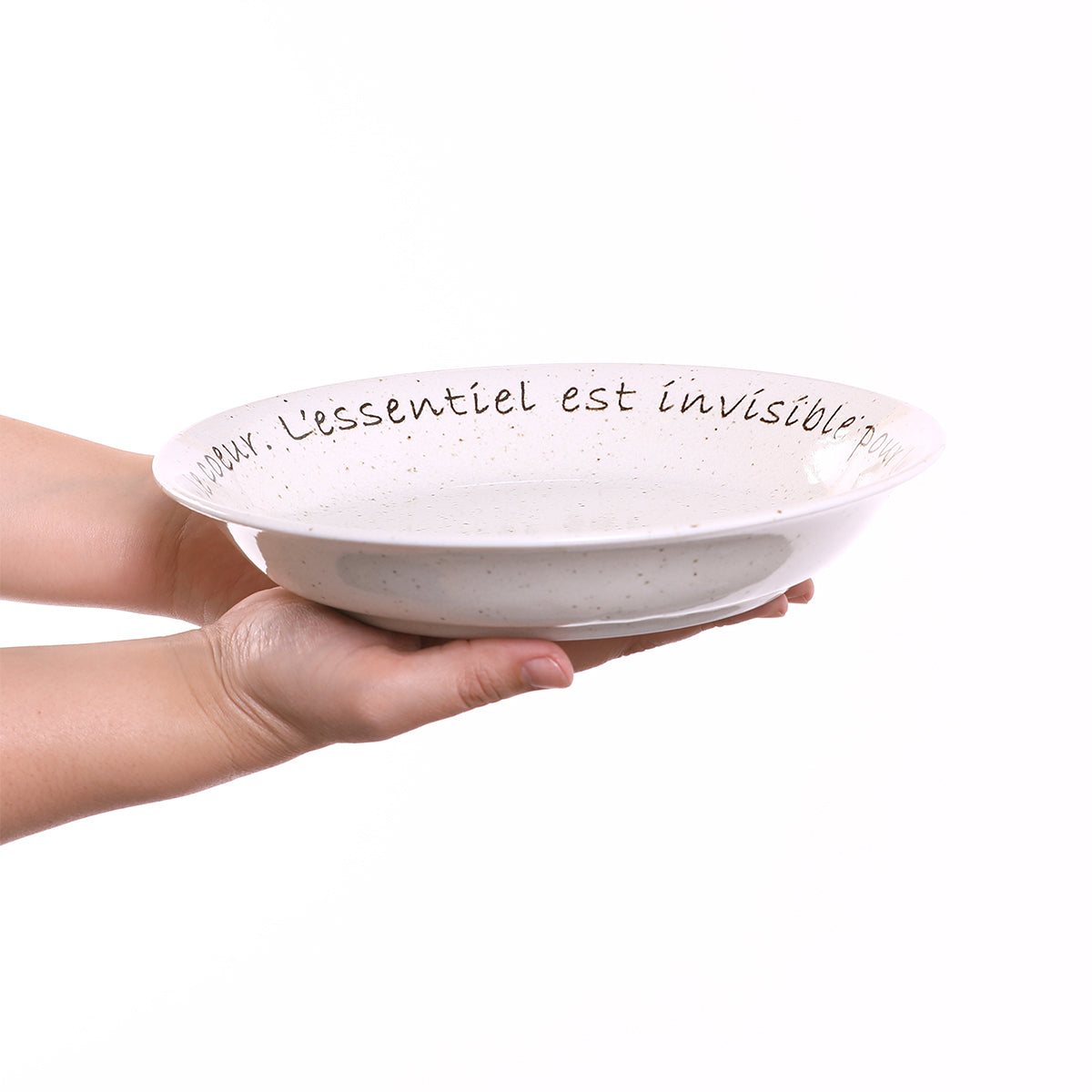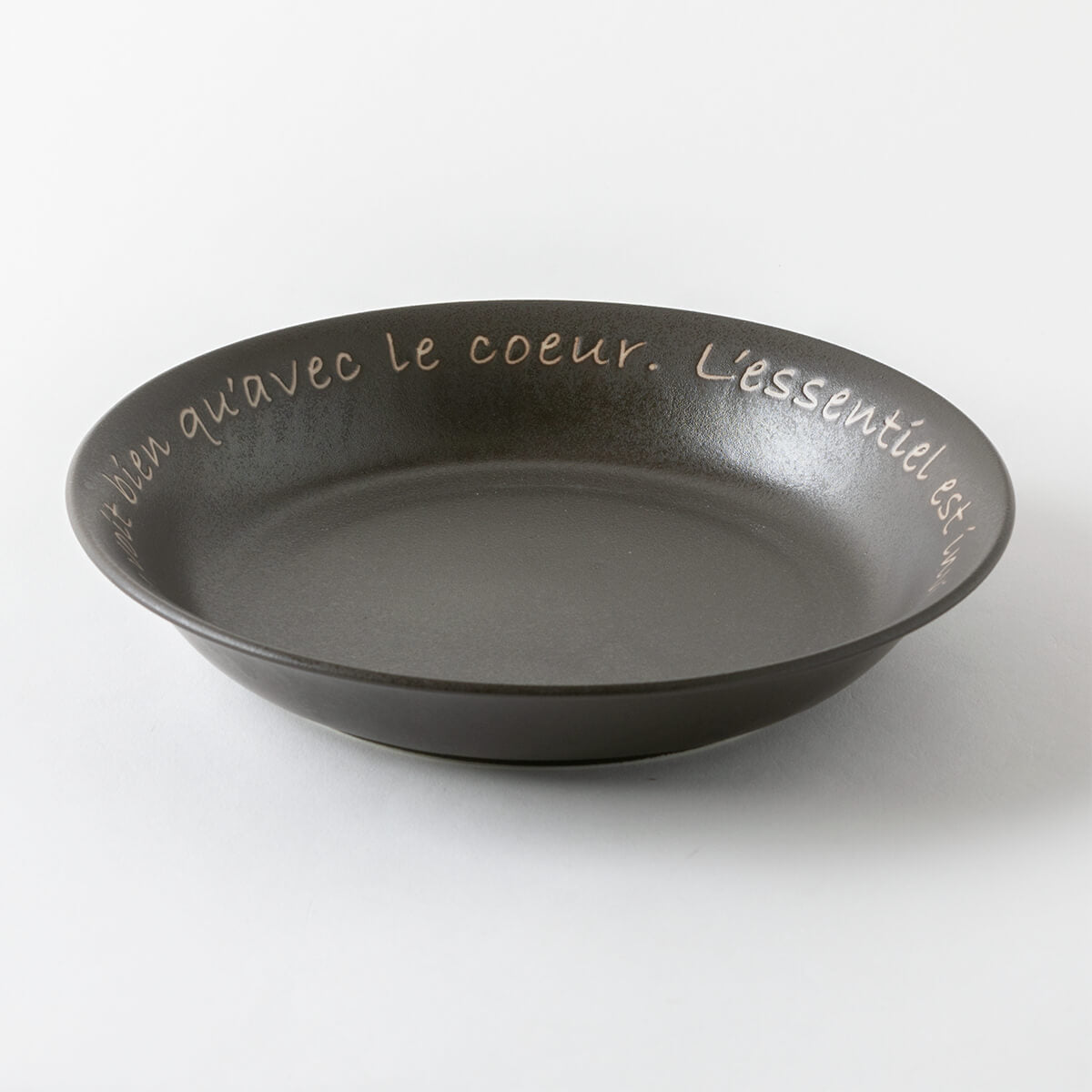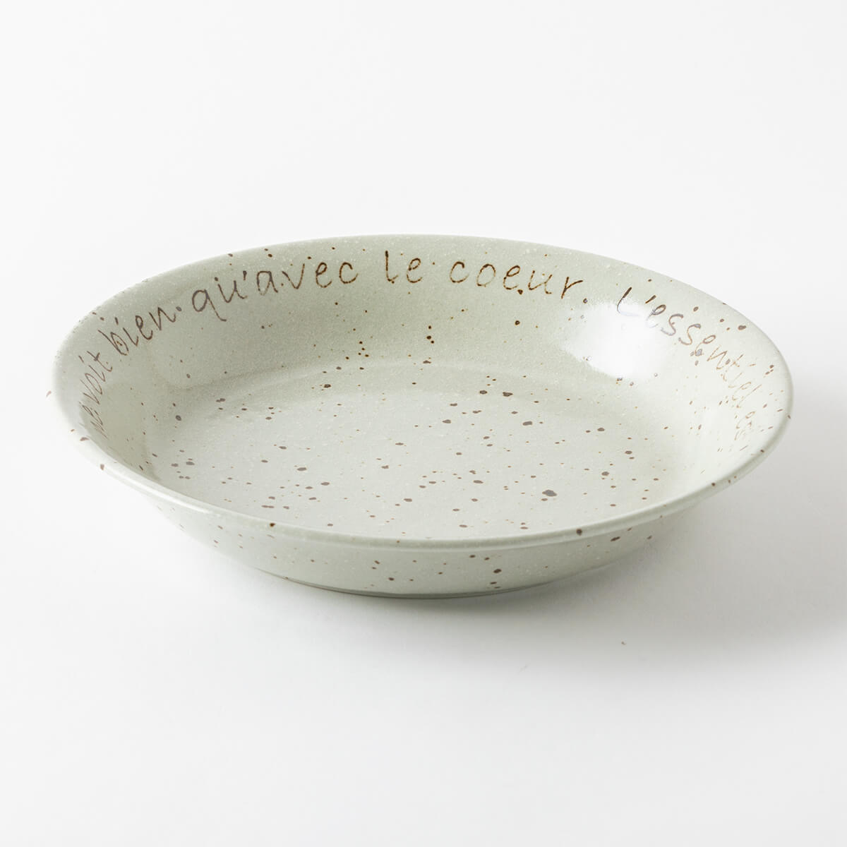お皿の縁に書かれたフランス語は、「心でしかよく見えないんだよ、大切なものは目には見えないんだ。」 -サン=テグジュベリー「星の王子様」より。